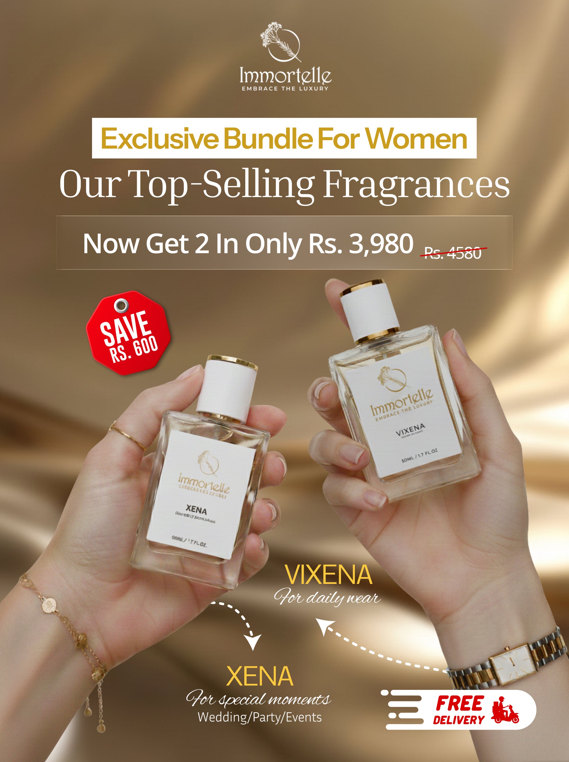 Celebrate your feminine charm with the Elegance Duo Bundle from The Immortelle. This beautiful pairing brings together Vixena and Xena, two graceful fragrances designed for women who love to feel confident, elegant, and unforgettable every day.